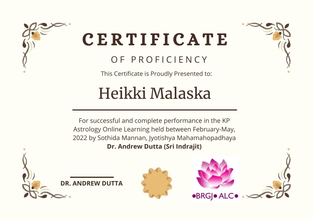 All our courses on easyastrologylearning.com can enable you to become a Certified astrology professional. Upon successful completion of the entire course, you can appear for a Proficiency Test to receive your Certificate of Proficiency from Bhagya Ratna Foundation, Kolkata and signatured by Dr. Andrew Dutta himself.